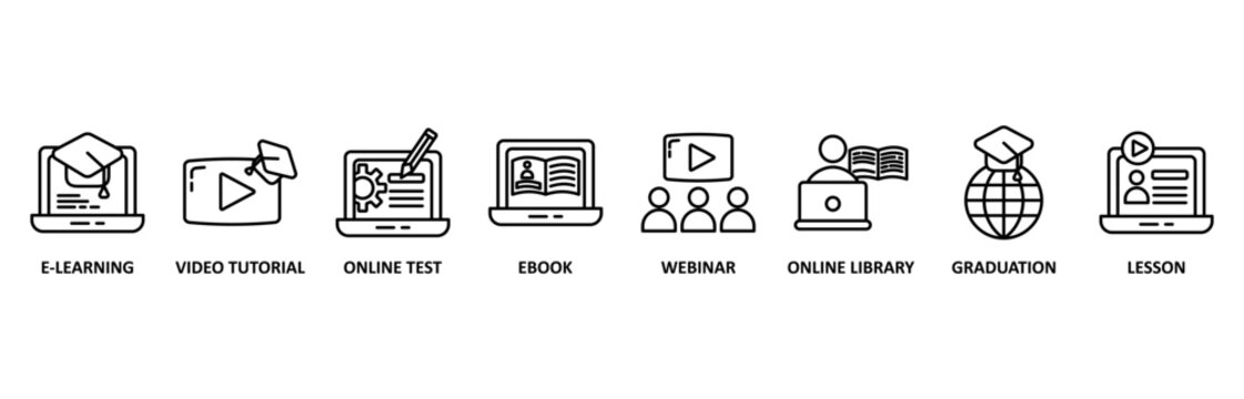 Online education icon set vector illustration for e-learning, video tutorial, online test, ebook, webinar, online library, graduation, lesson