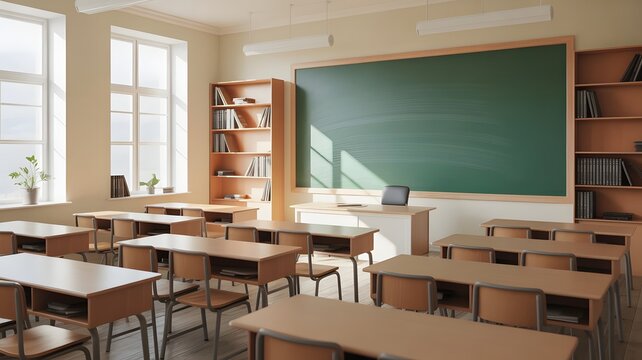 Bright and Clean Classroom Interior with Desks Chalkboard and Bookshelf for Learning