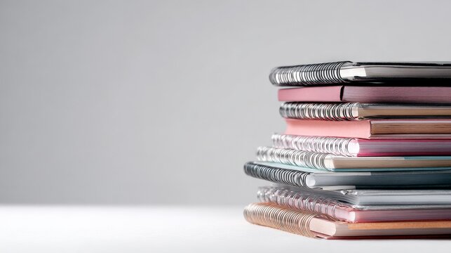 Neat pile and stack of spiral notebook and textbook for education, study, or school work at office. sense of readiness with supplies on clean background