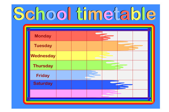 School timetable. Schedule for kids. Student plan template on blackboard with outline school icons. Weekly time table with lessons. Vector illustration. Educational classes diary on English, A4.