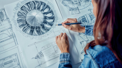 une ingénieure en train de dessiner un plan de turbine de moteur d'avion sur une feuille de papier