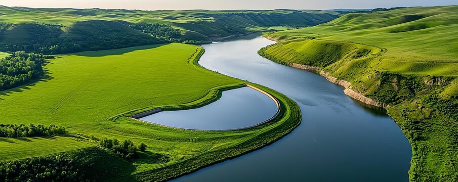 An ultra-sharp and clear image of a well-maintained levee protecting farmland from potential floods, highlighting infrastructure investments in natural disaster reduction, highly detailed