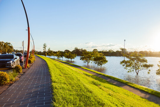 footpath with hill down levee bank in singleton with floodwaters covering playing field
