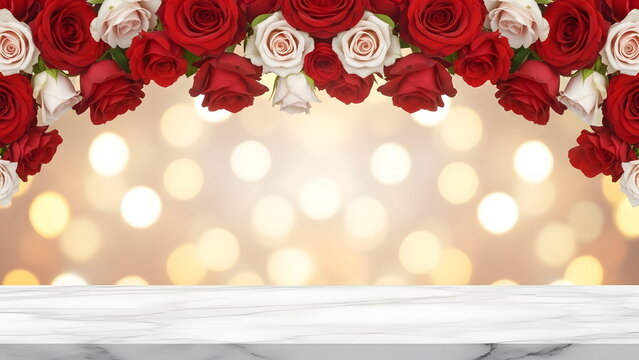 An eye-level shot captures a romantic floral arrangement with red and white roses above a pristine marble surface, creating an elegant and inviting aesthetic.  valentines day wallpaper background
