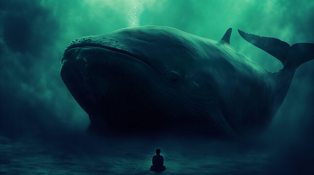 Jonah and the whale visualized with a tiny figure sitting thoughtfully inside a massive, shadowy leviathan under the sea, with copy space