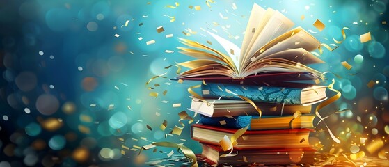 Celebratory Stack of Colorful Books Under Confetti, Education with A Festive Flair