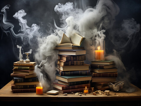 Book of Magic Burning with Elemental Fusion in an Enchanting Twilight Scen