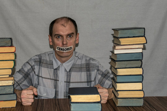The man looks ahead with a serious look, and his mouth is sealed with adhesive tape. On the tape the inscription "Censored".
