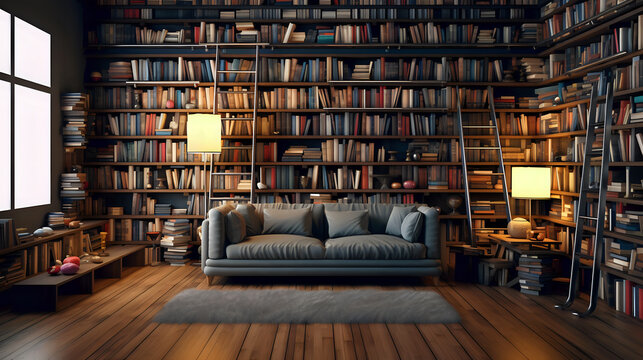 a sofa with a cozy bookshelf with colorful books on the background, a shelf on the entire wall with paper books of all bright colors in a home library with a sofa and candles