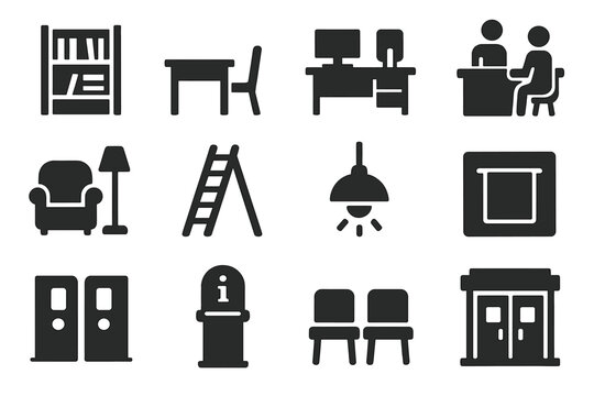 Library Infrastructure Icons. Solid style icons of library infrastructure: shelves, study desk, computer station, reference desk,