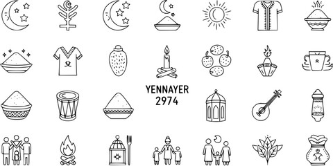 Yennayer 2974: Berber New Year icons set. Cultural line art symbols of North African traditions, celebration, and heritage including food, family, music, and nature.