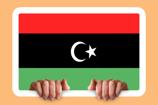 Hands holding a white frame with Libya flag, protest or social issues in Libya, independence day