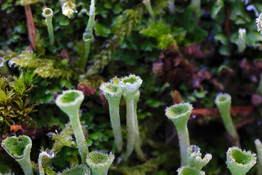 Trumpet lichen growing on tree trunk in Winter