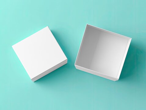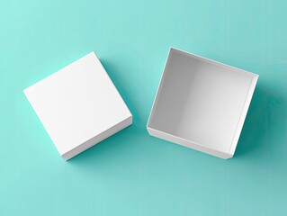 A pristine white square box, open and lid slightly askew, rests on a pale teal backdrop; clean, minimalist aesthetic