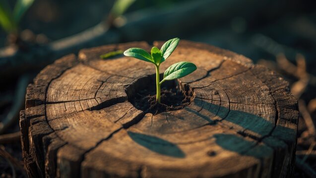 New life idea concept featuring a seedling sprouting from a tree stump. Business development and eco symbolism.