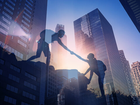 Teamwork, unity, life goals and self improvement concept. Man helping his friend climbing partner up a steep edge of a mountain, People showing kindness in the city