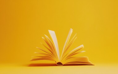 A book with pages turning, filled with life lessons and knowledge, set against a muted yellow background