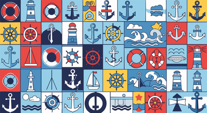 Nautical icons pattern. A vibrant, colorful collage of anchors, lighthouses, ships wheels, and life preservers