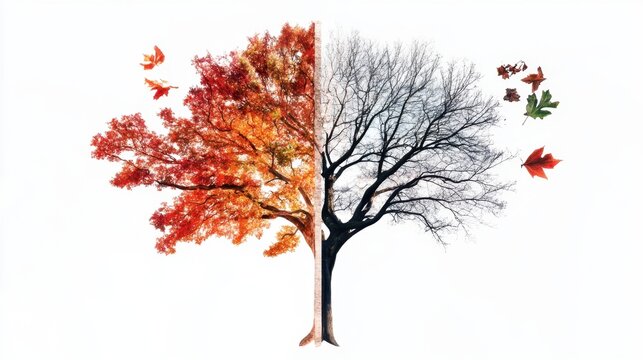 Half autumn half winter tree with colorful leaves and bare branches transition
