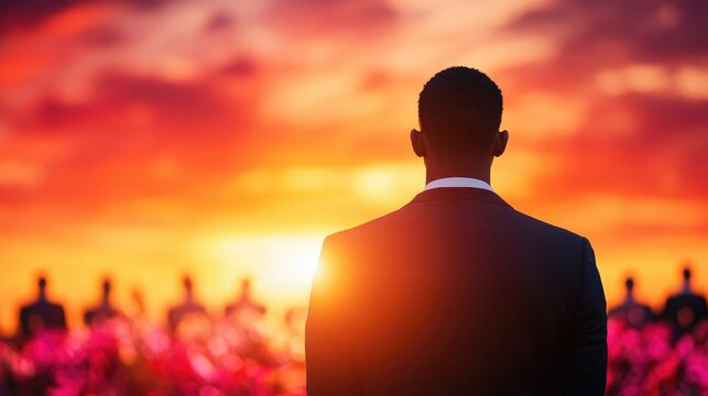 A fiery sunset framing a memorial speech at an outdoor funeral, paying homage to a life well-lived
