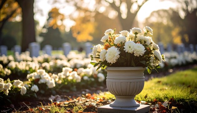 A lone figure in black walks among graves in a cemetery on an overcast day. Flowers adorn headstones, creating a solemn yet colorful tribute to those who have passed.