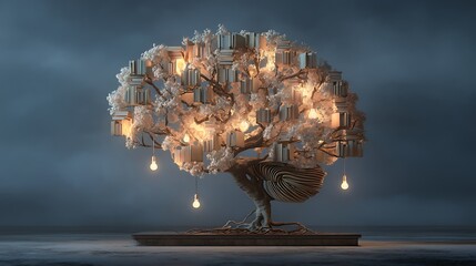 a metaphorical tree with glowing leaves shaped like books and lightbulbs growing from a human brain, symbol of lifelong learning and curiosity, magical realism, cinematic style —v 7