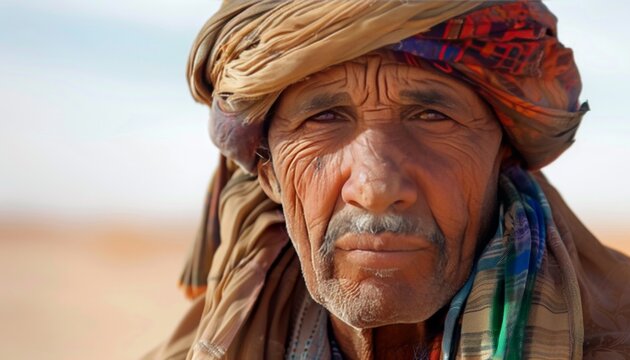 Man in arid desert, face showing resilience and challenges desert life. Harsh environment, survival