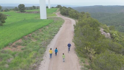 young athletic couple, a man and a woman, running together on a road with a natural landscape in the background