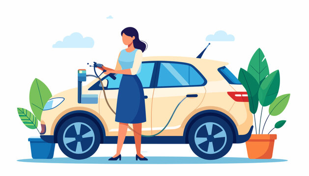 Woman charging her electric vehicle, showcasing a commitment to sustainable transportation and green energy. Modern eco-friendly lifestyle illustration for a cleaner urban future