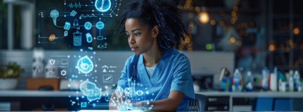 Young nurse in blue scrubs working at a desk with futuristic digital medical interface