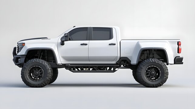 A side view of a lifted white pickup truck showcasing its rugged design.