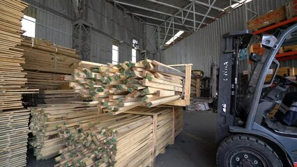 Forklift transports timber in and out of warehouse as vertical lifter