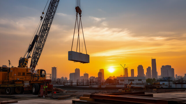 Crane lifts heavy material at sunset in city