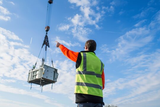 Construction site worker wearing hard hat, safety vest gives hand gesture to crane operator. Crane lifts shipping container under bright sun. Busy industrial zone with heavy machinery, teamwork,