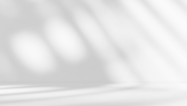 Empty white room studio with leaves shadow overlay effect for product presentation display. Cosmetic beauty fashion showroom. Morning sunlight through the window. Minimal Mock up interior background.