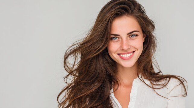 A woman with long hair smiles at the camera. She wears a light colored shirt and is in front of a neutral background. This scene takes place during the day.