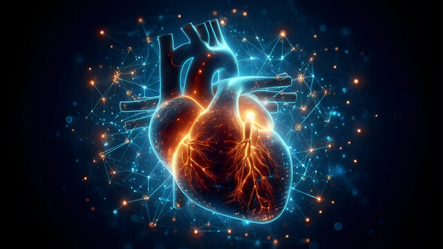 A highly realistic close-up of a glowing human heart in abstract.