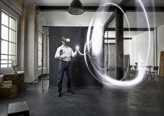 Mature man with vr glasses light painting in front of black backdrop in loft