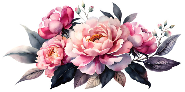 Watercolor painting featuring pink and light pink peonies with dark leaves on a black background on transparent background