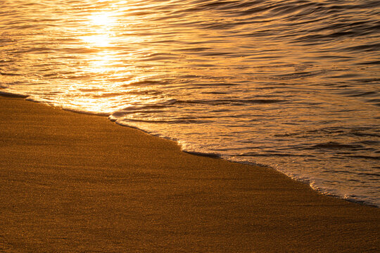 A couple walks hand in hand along the beach at sunrise, with the golden light reflecting on the calm sea and distant islands, creating a serene and romantic atmosphere.
