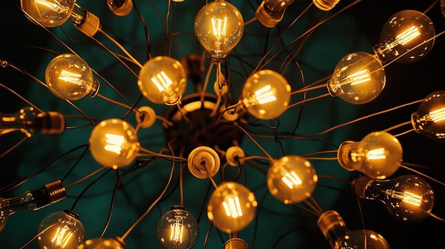 A group of light bulbs interconnected by wires, symbolizing teamwork, collaboration, and the flow of creative ideas. This visual representation highlights the power of collective effort