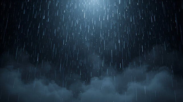 Falling raindrops footage animation in slow motion on dark black background with fog, lightened from top, rain animation with start and end, perfect for film, digital composition, projection mapping