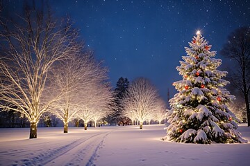 A decorated Christmas tree with warm lights glows brightly in a snowy landscape under a clear starry night, lined with lightened trees in a winter scene.