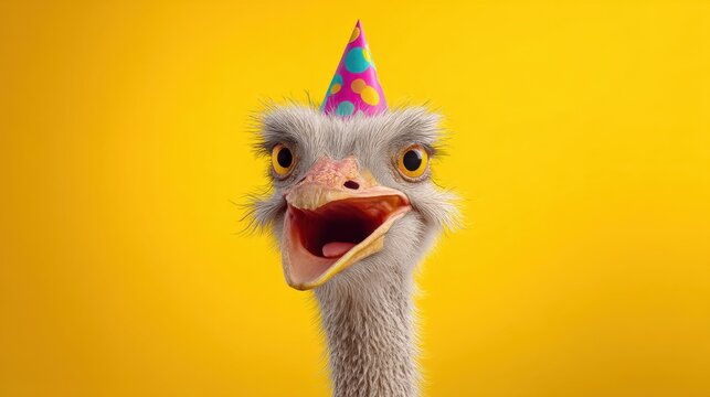 A cheerful ostrich dons a colorful party hat expressing excitement against a vivid yellow backdrop. The scene captures the spirit of celebration and joy perfect for any festive occasion.