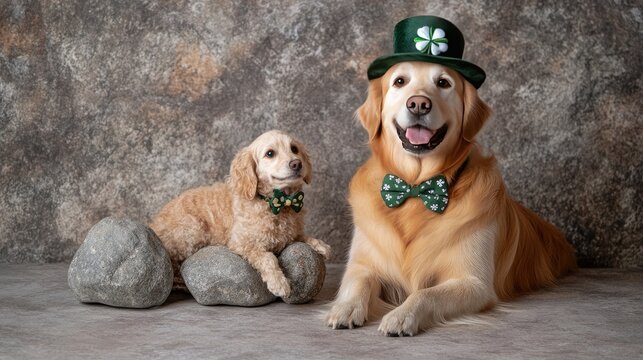 Two dogs dressed in festive green attire pose together for a cheerful celebration in a studio setting