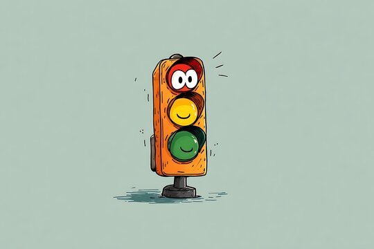 Cartoon traffic light with playful facial expressions, set against a minimalist background, creating a whimsical and lighthearted illustration.