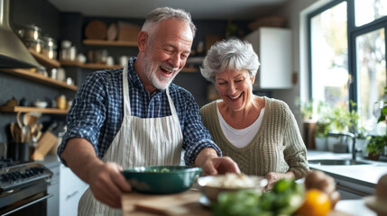 A senior couple enjoys a lighthearted moment in their kitchen, laughing together as they follow a recipe. The atmosphere is filled with warmth and companionship.