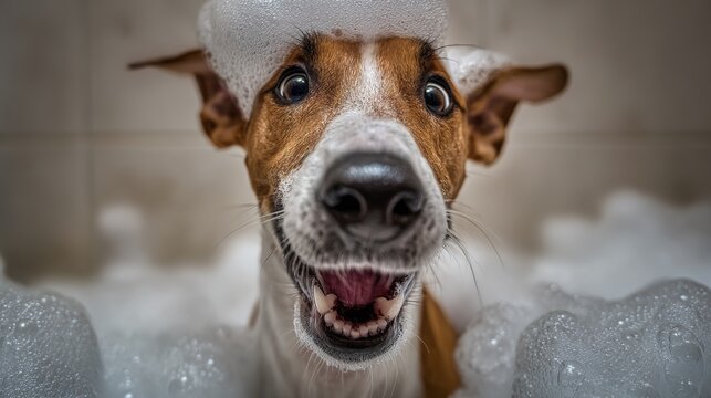 A playful dog enjoying a bubble bath, surrounded by foam and bubbles in a lighthearted moment