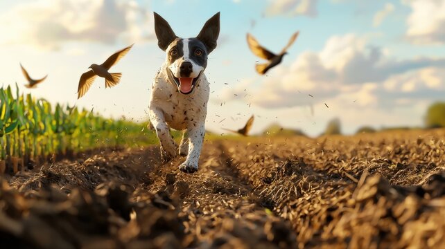 Cartoonish 3D render of a playful dog joyfully chasing birds across a freshly plowed field, capturing motion, humor, and a lighthearted countryside atmosphere in a colorful, whimsical style.