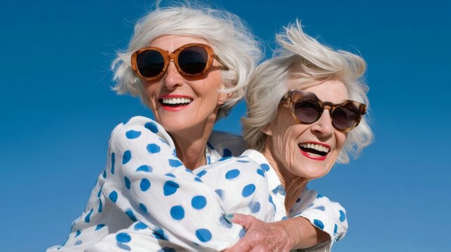 Two women wearing sunglasses and smiling, one of them is wearing a polka dot shirt. Scene is cheerful and lighthearted